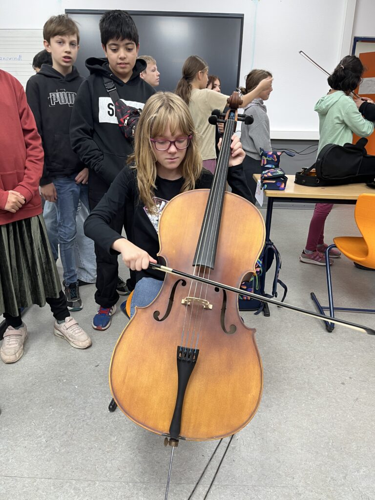 Bereits vorher hatte Herr Ganswindt in der Klasse 5 RS die Streichinstrumente vorgestellt. Am 6. Oktober durften die Kinder der 5 Gym bei Frau Bartkiewicz und Herrn und Frau Ganswindt die Streichinstrumente Violine, Viola und Violoncello näher kennenlernen und teilweise selbst ausprobieren.