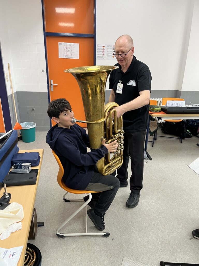 Am 7. Oktober ging es weiter mit den Blechblasinstrumenten. Philip Thrift brachte eine Auswahl an Instrumenten mit, die die Kinder in beiden Klassen erleben und ausprobieren durften, und zeigte auch gleich mehrere Möglichkeiten, wie man aus einfachen Mitteln eigene „Blechblasinstrumente“ selber bauen kann. Bei den Versuchen, Trompete, Horn oder Posaune selber zu spielen, zeigten einige Kinder erstaunliche Talente!