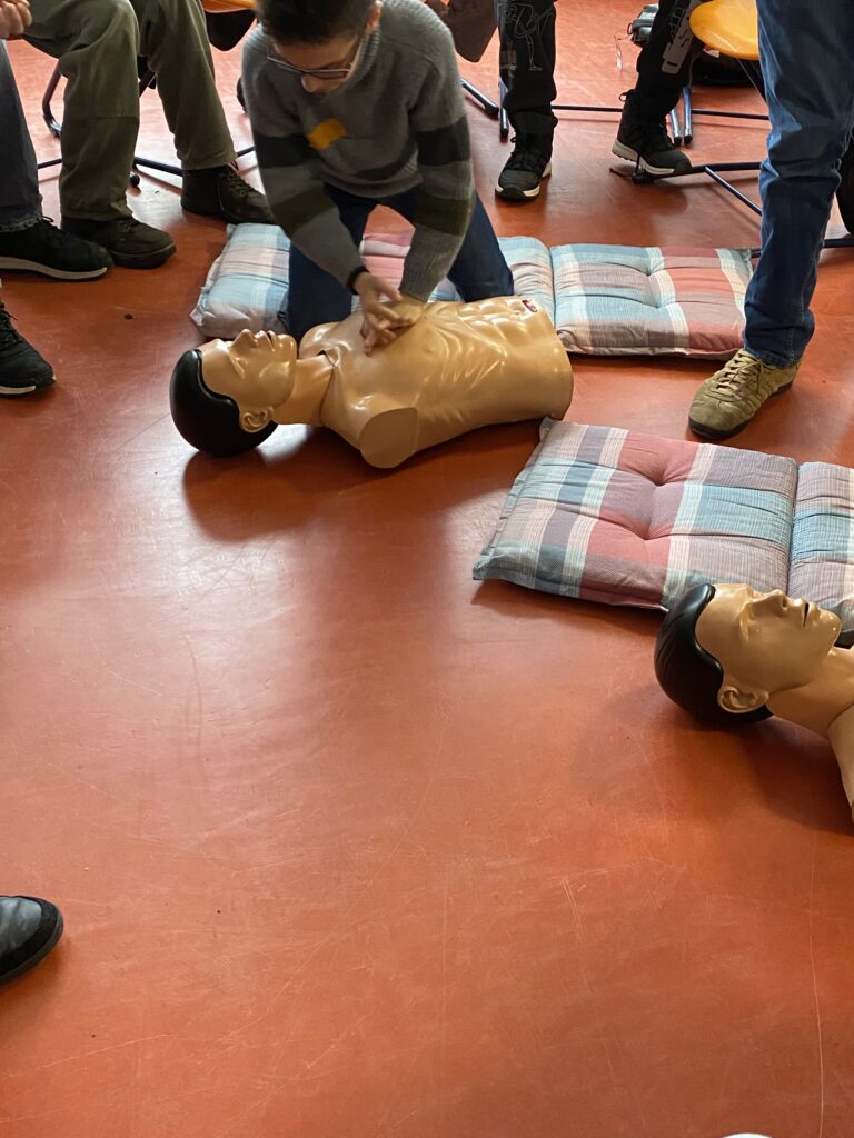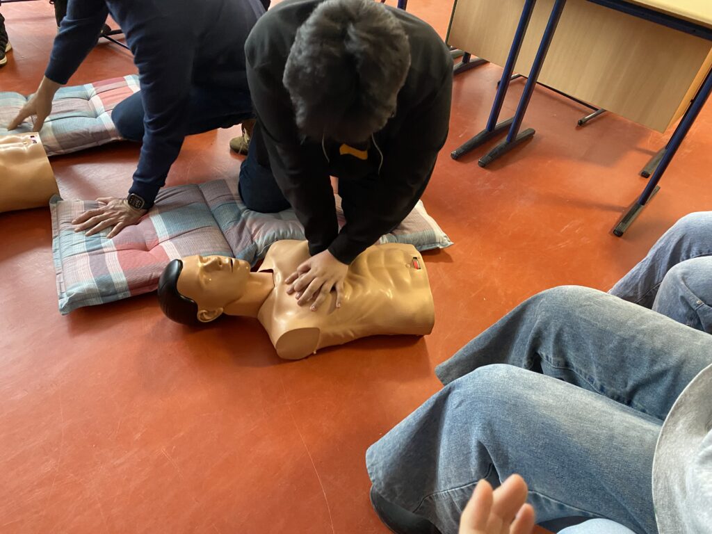 Die Klasse 7 GYM hat sich seit den Herbstferien im Biologieunterricht mit dem Körper, insbesondere den Funktionen vom Herzen, der Lunge und dem Blutkreislauf, beschäftigt. Am 14.01.2026 kam Herr Öztürk einen ganzen Unterrichtstag lang zusammen mit Jeffrey in die Leinetalschule, um mit den Schülerinnen und Schüler grundlegende Kenntnisse der Ersten Hilfe zu besprechen. Neben theoretischen Themen gab es auch praktische Einheiten zum Anlegen von Verbänden oder der stabilen Seitenlage. Auch Jeffrey konnte durch Herz-Druck-Massage, die die Schülerinnen und Schüler jeweils 2 Minuten unter Begleitung des Liedes „Atemlos“ durchführen mussten, gerettet werden.
