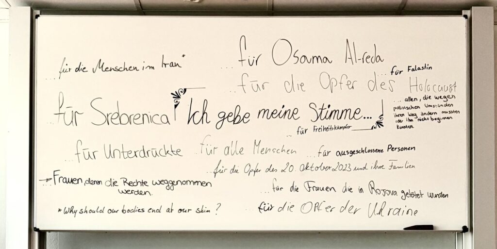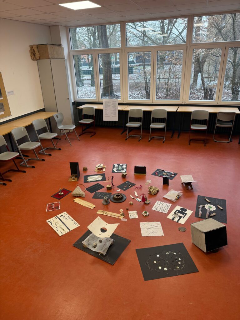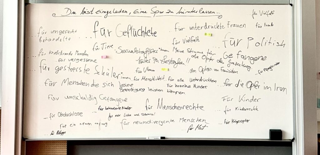 Wir arbeiteten künstlerisch: experimentierten mit Materialien, Anordnungen und Markierungen, hörten zu und veränderten, ohne persönliche Geschichten erklären zu müssen. Erfahrungen wurden in Fragmente, Leerstellen und Spuren übersetzt. Wir fragten danach, wie Personen, Gruppen, Länder oder Ideen künstlerisch eine Stimme erhalten, und luden Gäst*innen am Tag der offenen Tür ein, selbst Spuren an der Tafel zu hinterlassen.