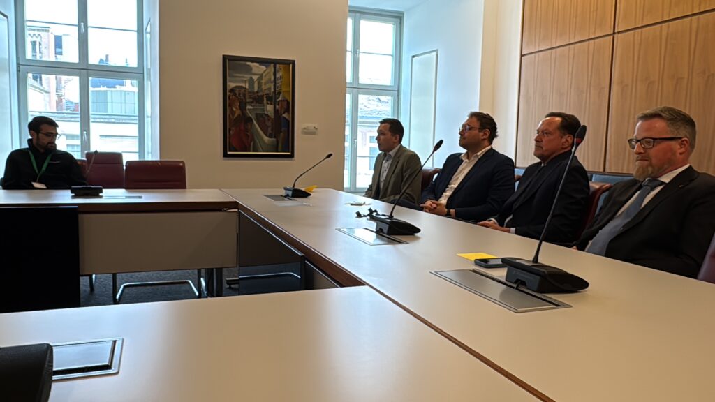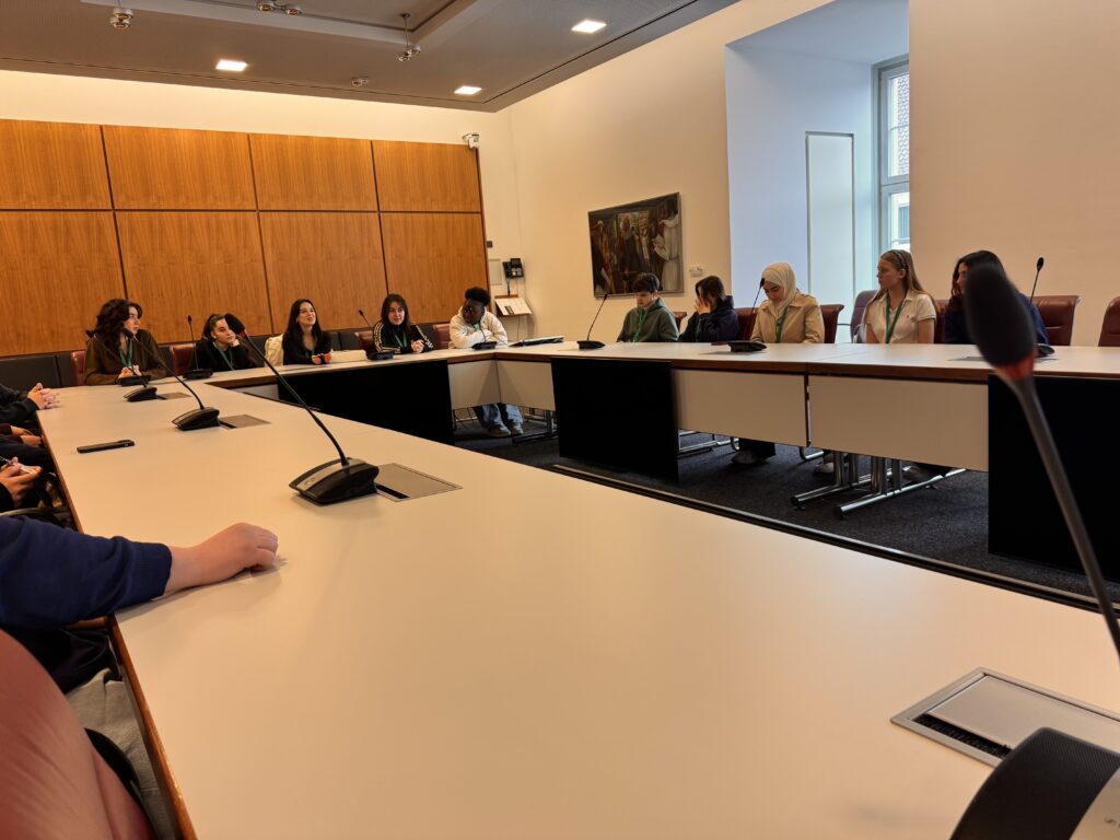 Nach unserer Ankunft im Landtagsgebäude wurden wir zunächst durch das Haus geführt. Dabei erhielten wir interessante Einblicke in die Architektur und vor allem die Arbeitsweise des Parlaments. Wir besuchten unter anderem den Plenarsaal, wo wir die Gelegenheit hatten, uns auf die Besuchertribüne zu setzen und einer laufenden Plenardebatte beizuwohnen. Es war ein besonderes Erlebnis, die Abgeordneten bei ihren Reden und im parlamentarischen Schlagabtausch zu erleben und die Atmosphäre im Saal hautnah mitzubekommen.